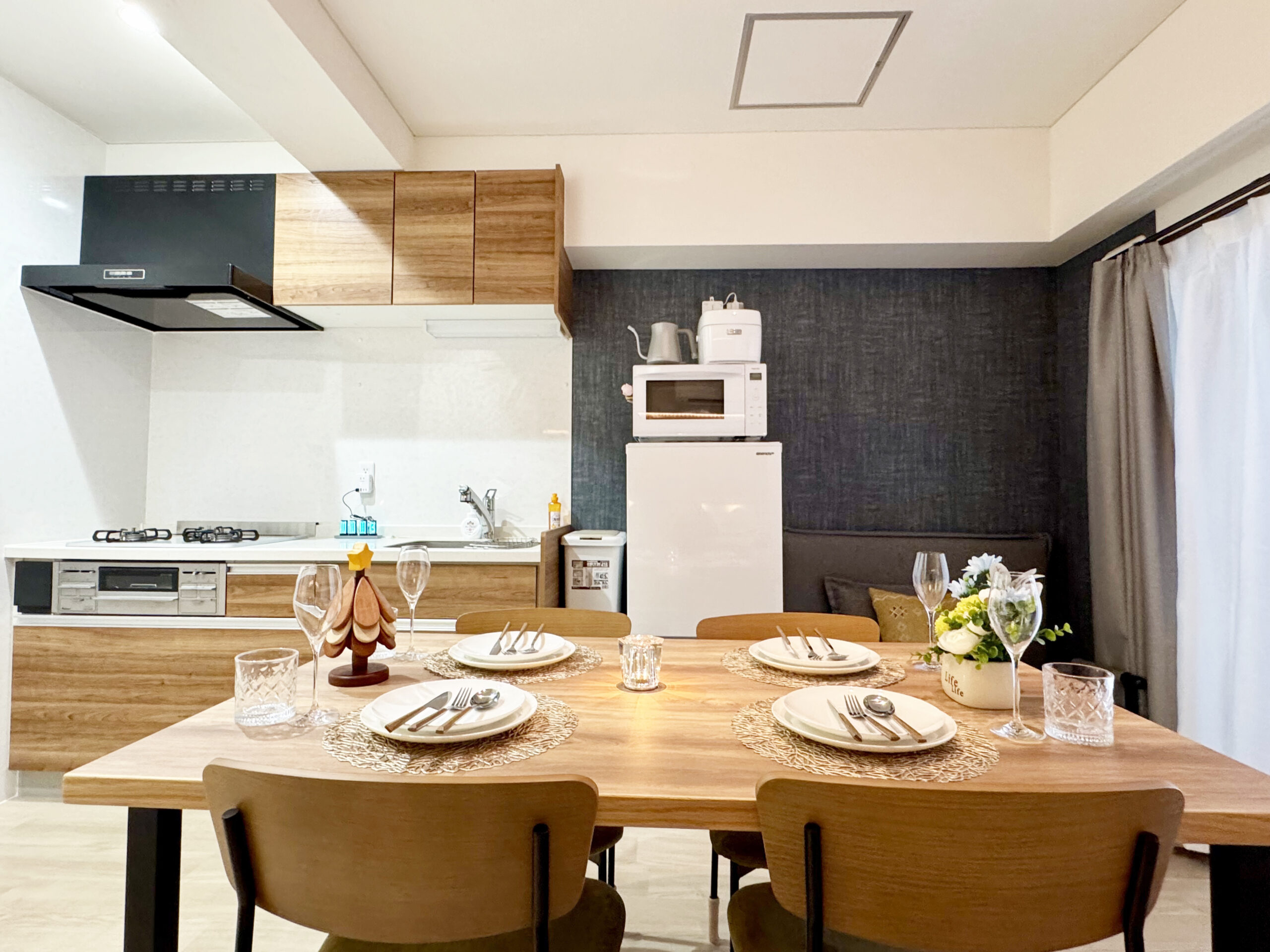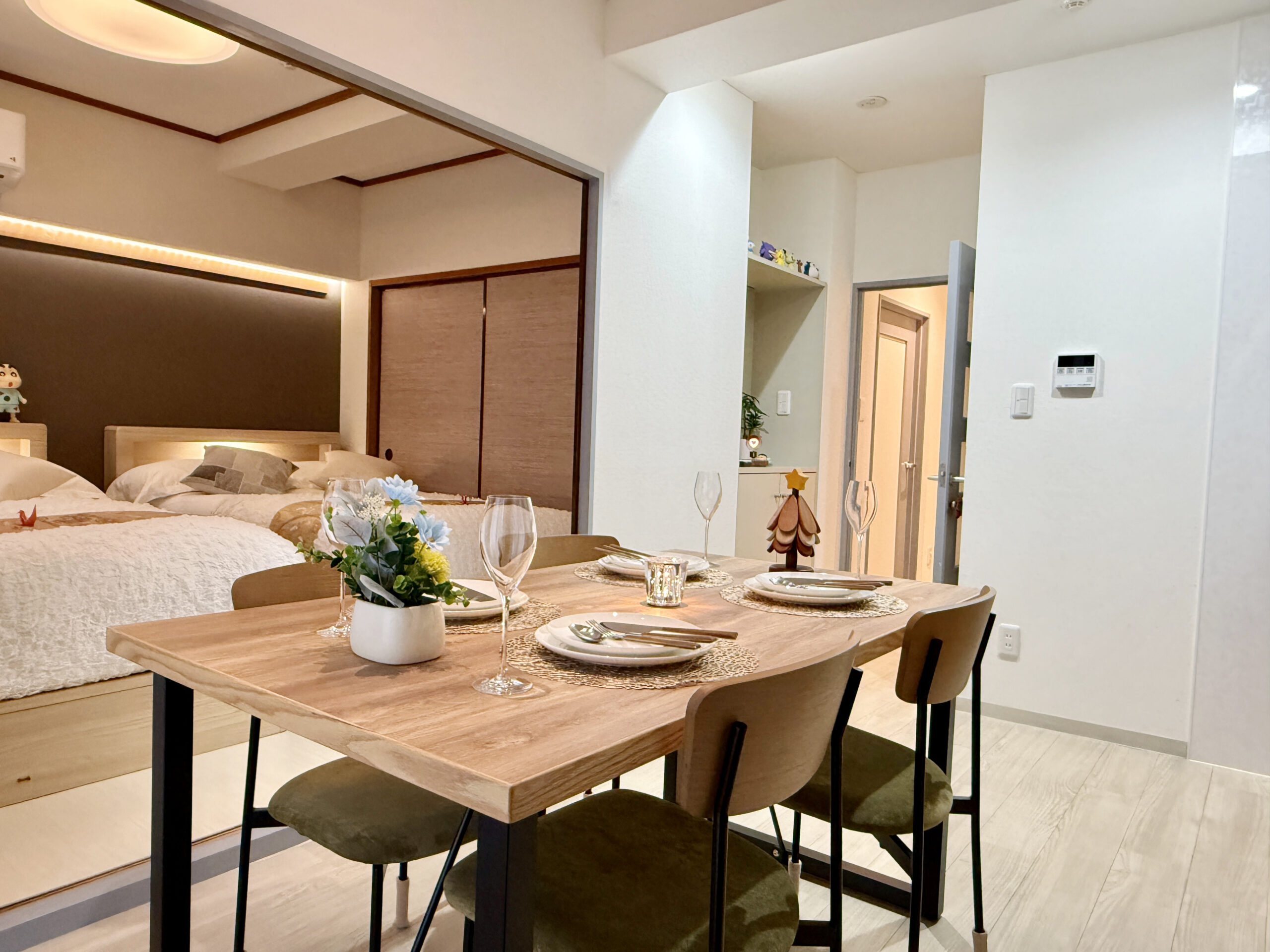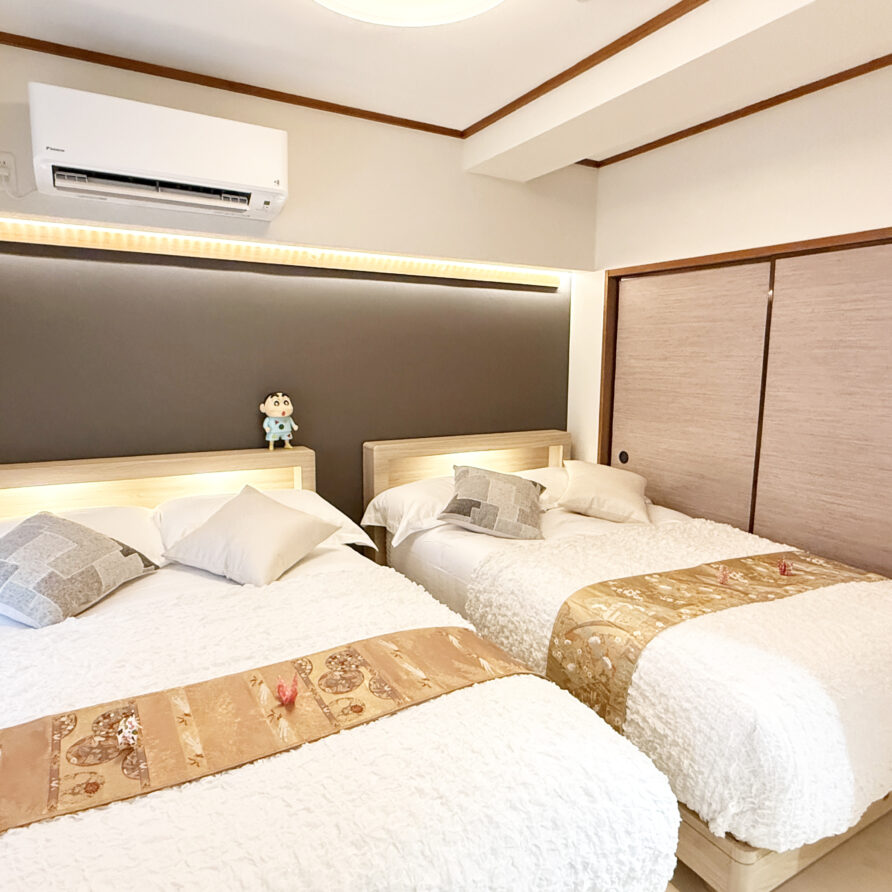 - Amenities: Air conditioner, Body wash, Clothes hangers, Cookware, Detergent, Electric kettle, Fan, Free WiFi, Hair dryer, Hot water kettle, IH stove, Microwave, Projector, Refrigerator, Rice cooker, Shampoo, Slippers, Smart toilet, Towels, Vacuum cleaner